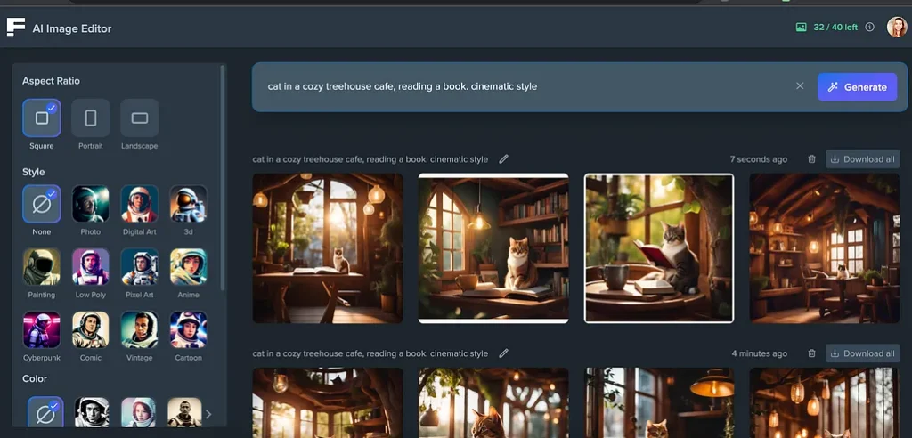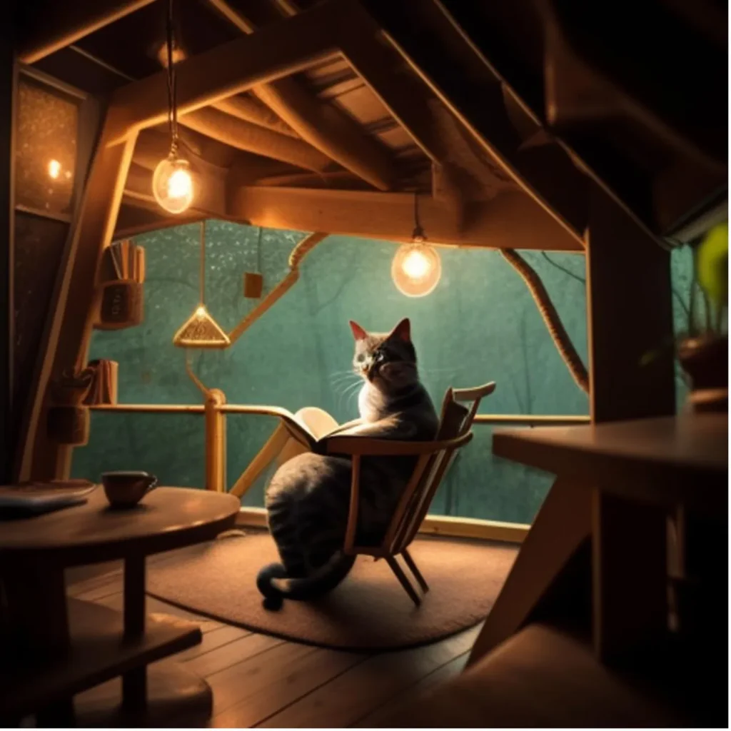 I’ll use the same prompt (“cat in a cozy treehouse cafe, reading a book. cinematic style”) for each generative AI tool, so you’ll be able to easily compare each art generator for your needs.