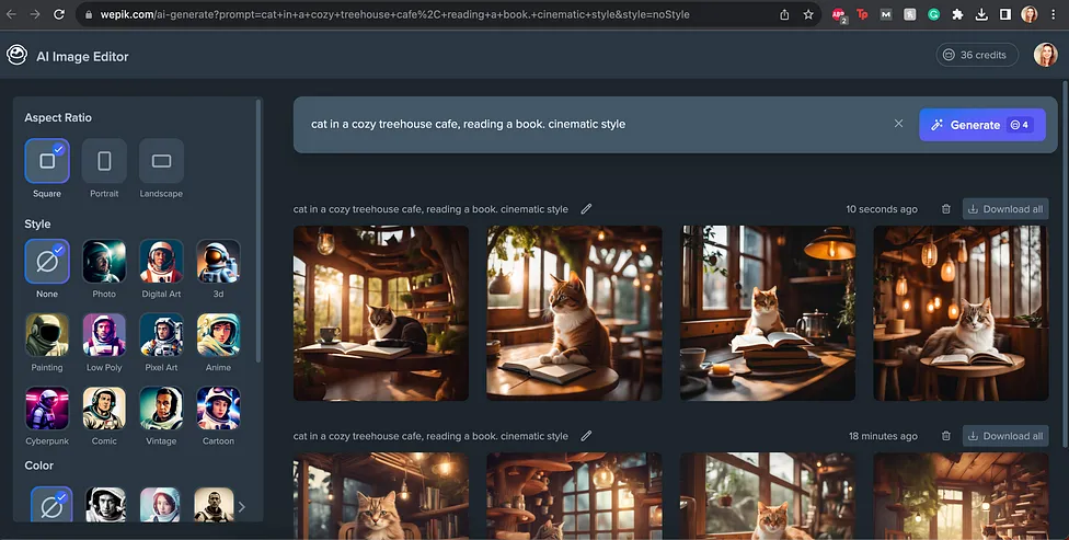 Note: I set out to review Wepik, another AI image creator. Turns out Wepik and Freepik are owned by the same people. The only difference is that on Wepik, you only get 40 credits, total, before you have to buy a pack for more. (100 credits for 5 euros.)