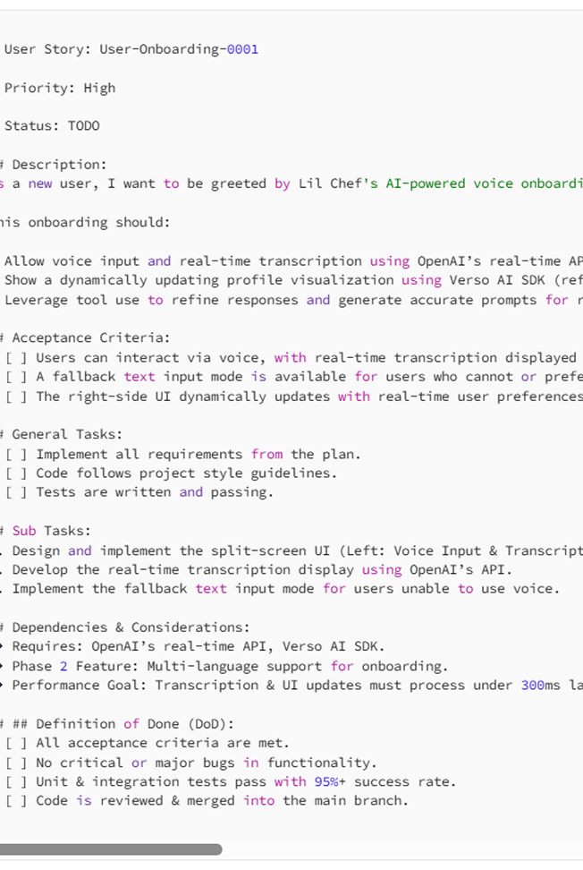 I have my PRD broken down into job stories, and those job stories basically act as “tickets.” Here is an example of a user-story.md: